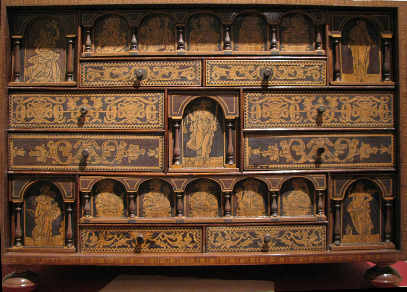 - Wood-on-wood inlay (intarsia or madera embutida) with black paste filling. Ornamental panel on a portable desk